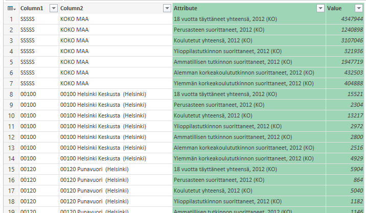 Tilastokeskuksen sivuilta voi ladata mielenkiintoista postinumeroittain luokiteltua dataa, kuten postinumeroalueiden asukasrakenteen, asukkaiden koulutusasteen, talouksien käytettävissä olevat rahatulot, rakennukset ja asunnot, jne. Jos olet kiinnostunut tutkimaan aineistoja, voit tehdä sen helposti Excelillä. Sellaisenaan Tilastokeskuksen sivuilta ladatun aineiston käsittely on hieman kömpelöä, sillä jokaista muuttujaa varten on oma sarakkeensa. Aineiston tutkiminen esimerkiksi pivot-taulukoiden, Power View -kaavioiden tai Power Map 3D animointien avulla helpottuu, kun käännät datan ensin raportoinnin näkökulmasta sopivaan muotoon Power Queryllä.