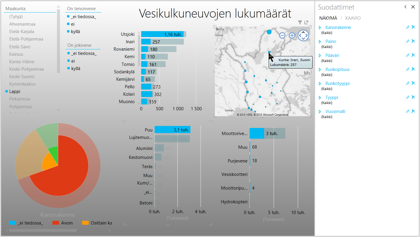- Lisäksi tietomalliin on ladattu Wikipediasta Suomen kuntatiedot, jotta raporteissa voi tarkastella vesiajoneuvoja esimerkiksi maakunnittain.
