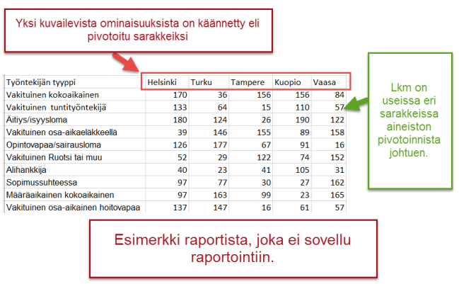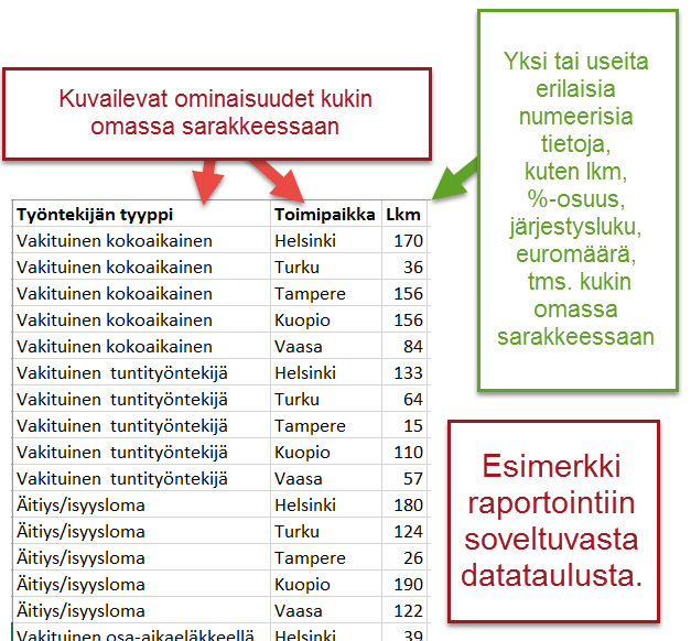 Raportointiin soveltuvan aineiston kussakin sarakkeessa on tietoa kuvaileva ominaisuus, kuten työntekijän tyyppi, toimipaikka, vuosi, sukupuoli tms. Kuvailevien sarakkeiden lisäksi taulussa on yksi tai useita erilaisia numeerisia tietoja, kuten lukumäärä, euromäärä, %-osuus, järjestysnumero, tms.