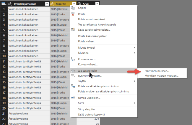 Muut sarakkeet kääntyvät jälleen kahdeksi sarakkeeksi, joista ensimmäisessä näkyy muodostamasi hierarkia erikoismerkkeineen ja toisessa luvut. Voit nyt jakaa sarakkeen käyttämäsi erottimen mukaan useaksi sarakkeeksi ja jatkaa kyselyeditorissa datan muokkausta, kuten tietotyyppien määritystä.