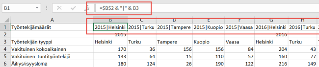 Sarakeotsikkohierarkian käsittely edellyttää hieman esivalmistelua jo lähdedatassa. Lisää lähdedatan yläpuolelle ylimääräinen rivi, johon muodostat otsikkorivin siten, että ylemmän (kuvassa vuosi) ja alemman tason (kuvassa toimipaikka) otsikoiden välillä on jokin erikoismerkki (kuvassa putkimerkki | ). Jos otsikkotasoja on useampia, käytä jokaisen tason välillä samaa erotinmerkkiä.
