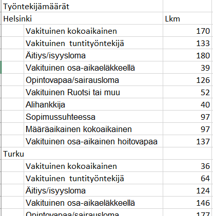 Huomaa myös, että erilaiset raporttiin lasketut välisummat (kuten työntekijämäärä toimipisteittäin) ovat yleensä täysin turhia ja jopa aiheuttavat ongelmia visualisointivaiheessa. Suodata ne siis pois datasta.