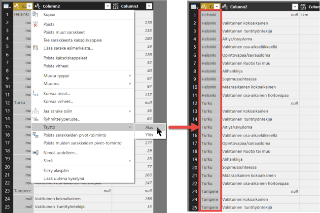 Voit täyttää sarakkeessa olevat ylätason otsikot Power BI Desktopin kyselyeditorissa pikavalikon Fill > Down (Täytä > Alas) -toiminnolla. Toiminto täyttää tiedot alapuolella oleviin null-soluihin. Tarvittaessa soluihin pitää Replace values (Korvaa arvot) -komennolla muodostaa null-arvot, jos niissä ei ole sellaisia.