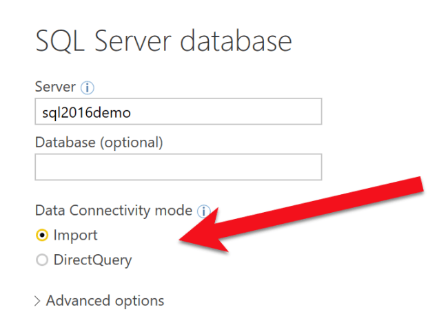 Kun ryhdyt tuomaan SQL dataa komennolla Home > Get Data > SQL Server (Aloitus > Nouda tiedot > SQL Server), määritä ensin SQL Serverin nimi ja valitse, että suoritat tuonnin (import).