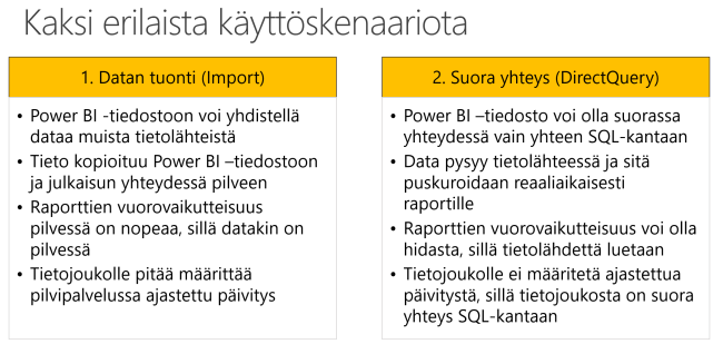 Power BI:ssä voi hyödyntää SQL-kannoissa olevaa dataa kahdella eri tekniikalla. Tauluja, näkymiä tai SQL-kyselyiden tuloksia voi joko tuoda (Import) Power BI -tietomalliin tai SQL-kantaan voi ottaa ns. suoran yhteyden (DirectQuery).