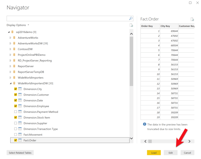 Jokaisesta valitsemastasi taulusta muodostuu yksi kysely ja kukin kysely latautuu tietomalliin yhtenä tauluna ellet yhdistele tauluja jollakin tavalla kyselyeditorissa. Kun siirryt Power BI:n kyselyeditoriin Edit (Muokkaa) -toiminnolla, kaikki kyselyeditorin muokkaustoiminnot ovat käytettävissä eli voit tehdä rajoituksetta datalle mitä tahansa kyselyeditorissa tarjolla olevia muunnoksia, suodatuksia jne.