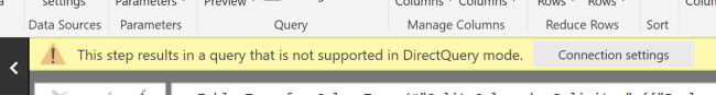 Kun valitset käyttöön suoran yhteyden (DirectQuery) ja olet siirtynyt kyselyeditorin puolelle muokkaamaan dataa, kaikkia kyselyeditorin toimintoja ei voi käyttää.