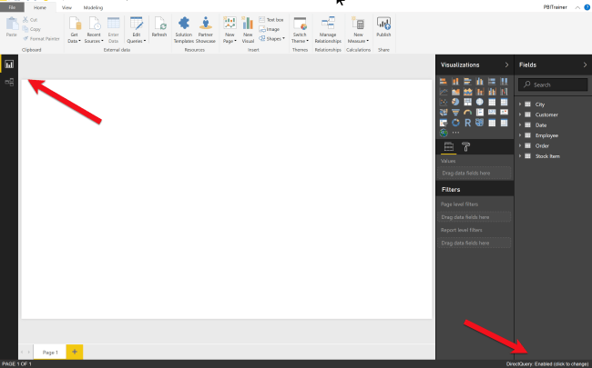 DirectQuery-tilassa alhaalla tilarivillä lukee DirectQuery ja PBI Desktopin käyttöliittymässä on vain kaksi välilehteä.