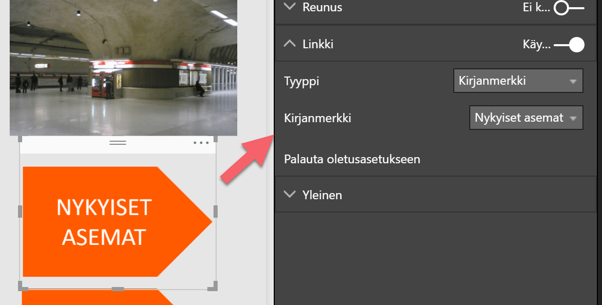 Sen sijaan, että kirjanmerkkejä aktivoidaan kirjanmerkkiruudun avulla, niitä voi aktivoida myös painikkeen kaltaisen kuvan tai muodon avulla. Koska Power BI:n muotoja on kovin vähän, painike pitää yleensä toteuttaa kuvana ja lisätä kuva sivulle. Kun kuva on lisätty sivulle, sen voi muotoilla linkiksi ja määrittää, mikä kirjanmerkki aktivoituu kuvaa napsauttamalla.