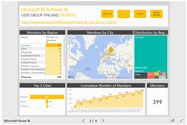 - Microsoft BI & Power BI User Group Finland -visualisoinnissa oikeassa yläkulmassa olevat painikkeet aktivoivat kirjanmerkkejä, jotka sisältävät kunkin raporttisivun sellaisenaan. Kirjanmerkkeihin ei ole tallennettu suodatuksia tai muita aiemmin mainittuja ominaisuuksia.