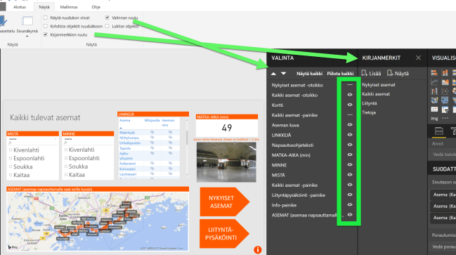 - Metroaikataulu ja asemat -visualisoinnissa Nykyiset asemat/Kaikki asemat -on toteutettu yhtenä sivuna, johon on tallennettu kaksi eri kirjanmerkkiä. Toisessa kirjanmerkissä näytetään kaikki asemat ja toiseen on puolestaan suodatettu vain nykyiset metroasemat. Lisäksi kirjanmerkeissä on tiedot mitkä otsikkotekstit ja painikkeet näytetään ja mitkä ovat piilossa. Käytännössä otsikot ja painikkeet on piirretty päällekkäin ja niistä näytetään kussakin kirjanmerkissä vain toinen.
