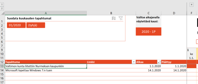 Kaava katkaisee kuvaustekstin 5 merkin mittaiseksi, jottei teksti vierity oikeanpuoleisen solun päälle. Tarkoituksena ei ole näyttää kalenterialueella koko tekstiä, ainoastaan muutama merkki tekstin alusta.